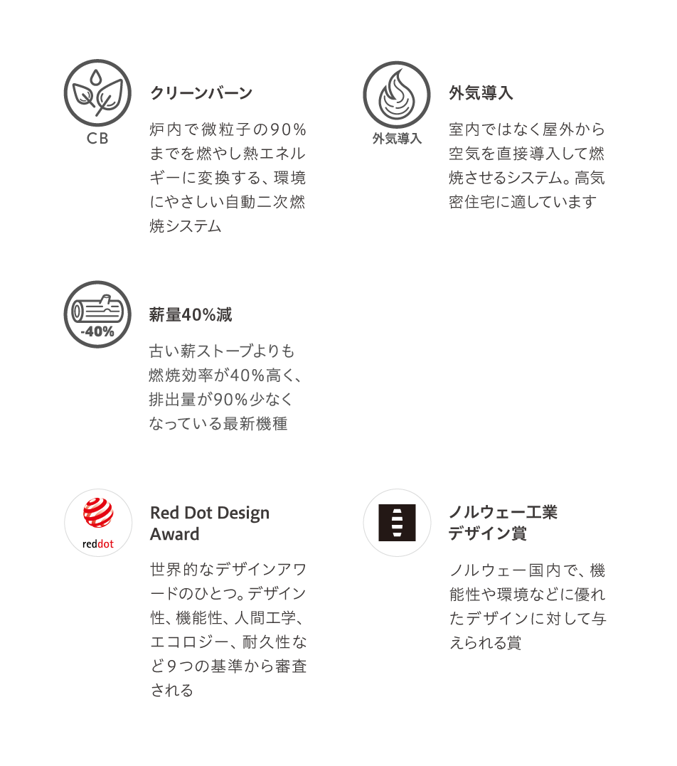 世界的なデザイン賞を次々に受賞している Hareide Design によるデザイン。フロントの丸みがノルウェーらしいやさしい印象を際立たせています。最新のクリーンバーン技術から生まれるオーロラの炎は圧巻です。 低燃焼時に最適な機能を発揮するように設計されており、環境にもやさしい炎を演出します。本体は二重構造なので、可燃壁にも省スペースで設置が可能。 サイドガラスは好みで選択できます。
